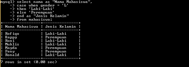 CASE digunakan untuk menentukan nilai keluaran/output data yang tidak sama dengan nama asalnya, misal ketika data aslinya adalah L, maka outputnya adalah Laki-Laki, dan sebagainya sesuai yang kita inginkan. Hal ini sama dengan fungsi ' if ' jika pada bahasa pemrograman JAVA, C, C++ atau bahasa pemrograman lain, yaitu untuk menentukan nilai dari suatu kondisi.